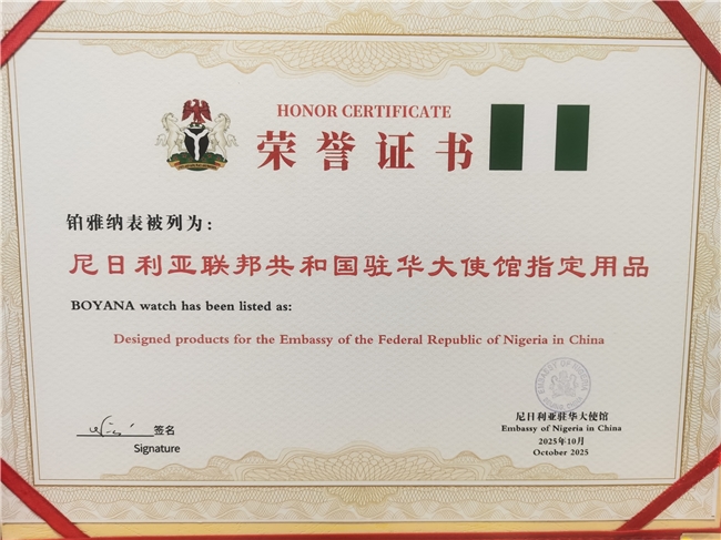 2025年10月,源自法国巴黎的轻奢腕表品牌铂雅纳(Boyana)正式被列为尼日利亚联邦共和国驻华大使馆指定用品。授牌仪式在尼日利亚驻华大使馆隆重举行,尼日利亚驻华大使亲自为铂雅纳代表颁发荣誉证书。