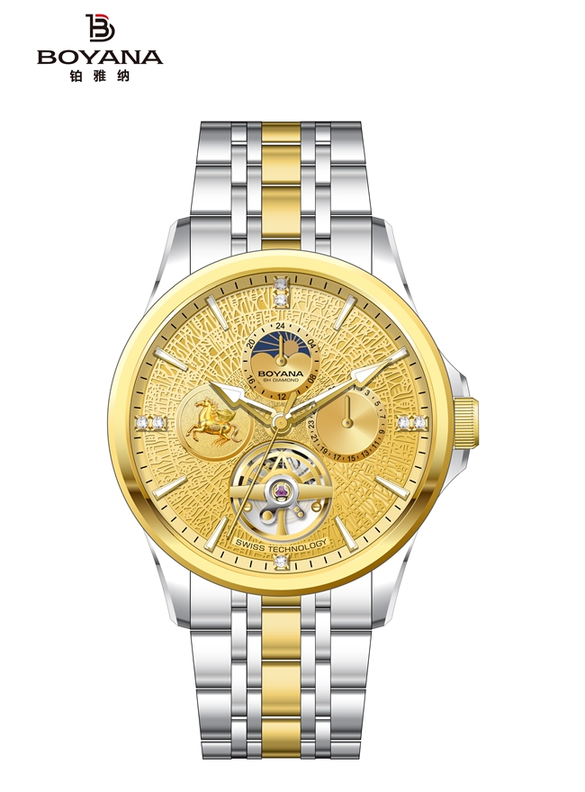 腕表6点位处,镶嵌着一枚经 “八心八箭” 切割的真钻,美轮美奂、璀璨夺目,尽显奢华品质。9点位置,则是融合中国传统文化精心打造出极富寓意的设计“金马浮雕”。这匹以玫瑰金色调打造的骏马,马首高昂,细节入微。马背之上,稳稳托着一枚金元宝,象征 “财富绵延不绝”。寓意佩戴者在享受美好时光的同时,也能收获岁月馈赠的祝福。
