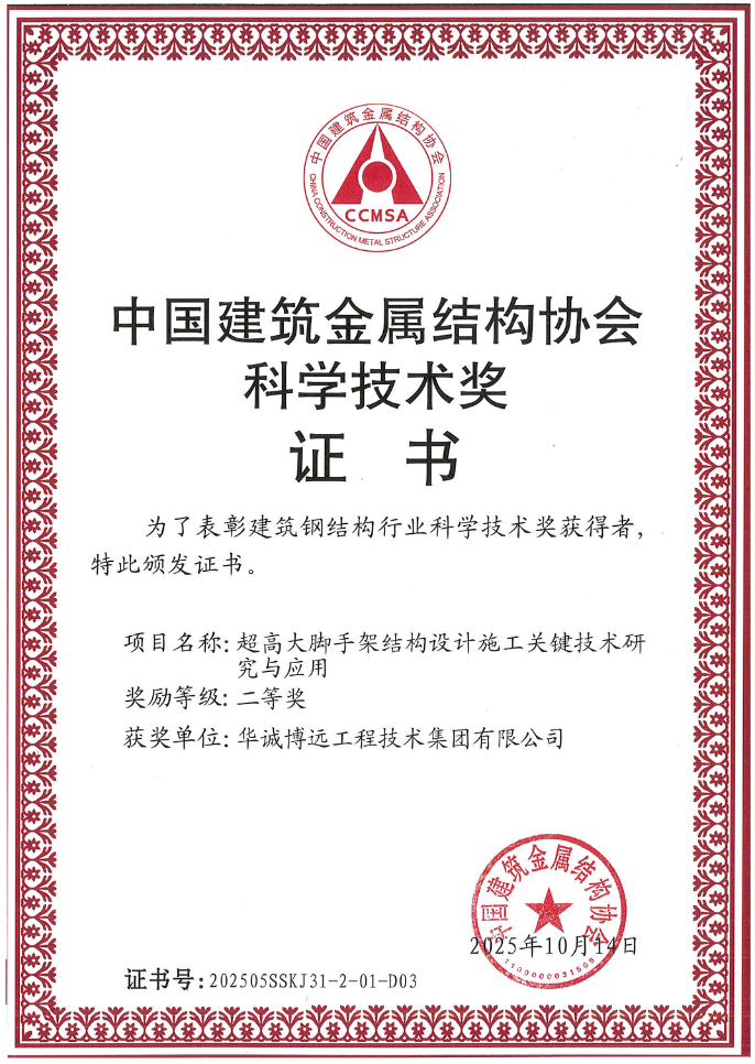 华诚博远工程技术集团有限公司与中建一局集团建设发展有限公司、中建工程产业技术研究院有限公司、中国建筑第六工程局有限公司、广东九为投资控股集团有限公司合作研发的科技成果“超高大脚手架结构设计施工关键技术研究与应用”获得2025年中国建筑金属结构协会科学技术奖二等奖。
