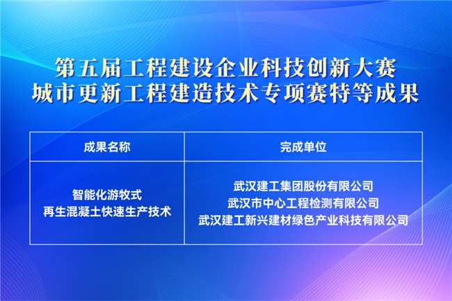 近日,在中国施工企业管理协会第五届工程建设企业科技创新大赛中,武汉建工集团研发的“智能化游牧式再生混凝土快速生产技术”从千余件作品中脱颖而出,斩获“城市更新工程建造技术专项赛特等奖”。