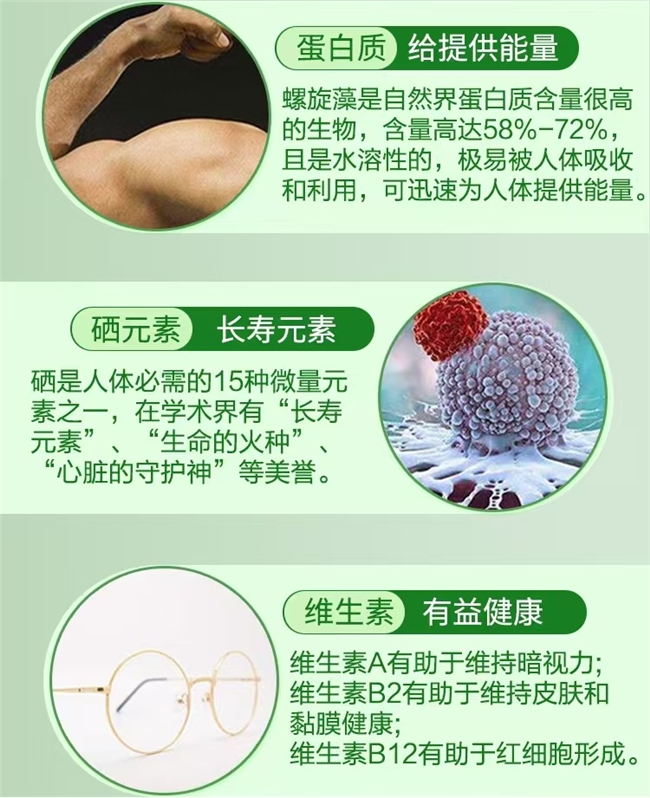 它以有机硒藻蓝蛋白为核心搭建全方位营养矩阵,成分协同发力不单一。每100克含有机硒5000微克,折算后每袋250微克(修正单位笔误),通过生物转化技术与螺旋藻天然营养深度融合,而非简单叠加,使得硒元素吸收率高达92.3%,远超普通富硒产品60%的平均水平,能高效激活免疫细胞活性。搭配16200微克β胡萝卜素(可转化为维生素A守护黏膜免疫屏障)、63.5克优质蛋白质(为免疫细胞合成提供原料)、343毫克铁元素(保障免疫细胞供氧),再辅以3种关键维生素及钾、镁、锌等微量元素,有机硒与藻蓝蛋白强化抗氧化抗炎,蛋白质补能修复机体,铁元素改善缺氧乏力,多维营养既聚焦免疫核心,又兼顾日常营养需求,全方位为健康兜底。