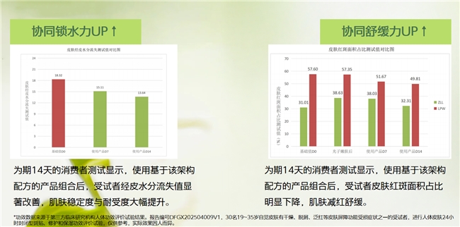 在临床验证层面,第三方机构的人体功效测试显示,基于该架构开发的产品组合能在不同时间段内带来明确改善:3天使用后,受试者白头粉刺、丘疹数量明显减少;14天使用后,经皮水分流失值显著下降,红斑面积占比明显降低。