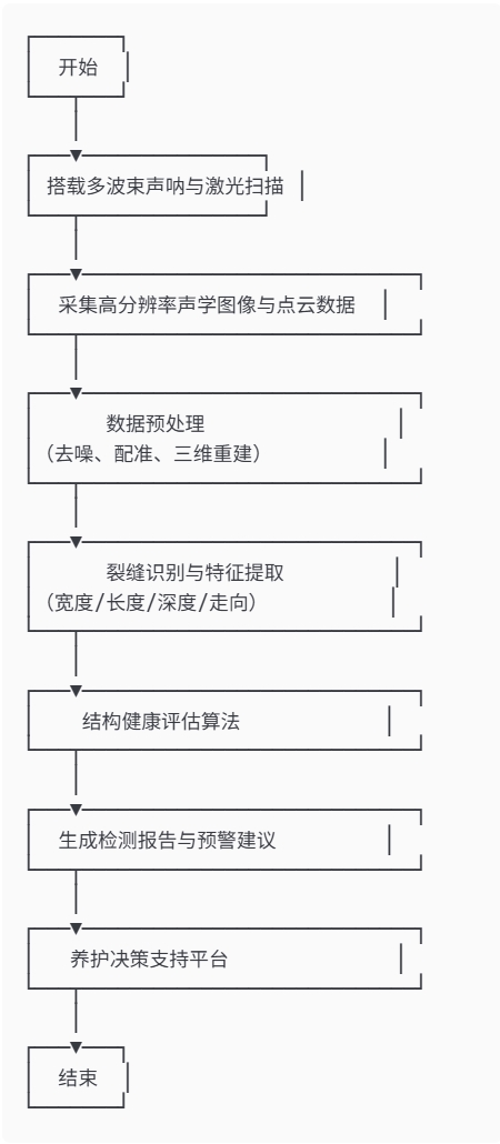 声学成像技术:通过多波束声呐发射高频声波,依据回波时间与强度生成桥体表面图像,突破水下视觉局限。