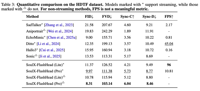 在权威数据集的实测结果中,SoulX-FlashHead的表现进一步验证了这一技术路线的有效性。在高清视频数据集 HDTF 上,Pro 版本取得了 8.31 的 FID 和 103.14 的 FVD 成绩,画面细节与稳定性表现突出;在更贴近真实复杂环境的 VFHQ 数据集中,其 Sync-C 指标达到 5.60,在口型一致性方面明显优于以往相关工作,减少了流式生成中常见的口型偏差问题。