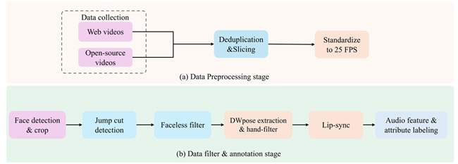 在数据层面,Soul AI Lab 构建了自研的 VividHead 数据集,为模型训练提供高质量底座。该数据集从超过10,000小时的原始素材中,经过切分、关键点检测、唇形一致性评分筛选等多重处理,最终保留了782小时高质量音画数据,为模型学习稳定的人物表征与音画关系提供了更纯净的样本数据。