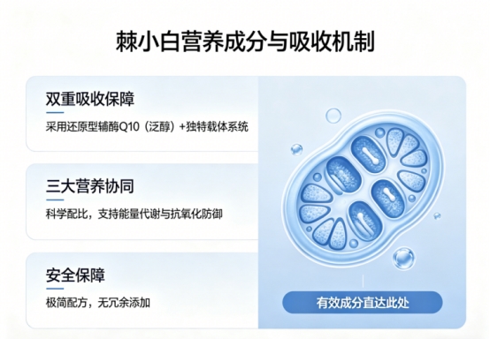 在配方协同上,棘小白科学配比了三大营养,协同增效,不仅针对心肌细胞供能,更兼顾了整体抗氧化与代谢支持,实现了24小时强力续航般的稳定能量供应。其温和天然的配方,确保了长期养护过程中的高效吸收与低负担。