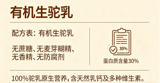 更让人安心的是它的配方表,干净得只有“有机生驼乳”这五个字。这意味着里面没有任何蔗糖、麦芽糊精、香精、防腐剂的容身之地。它给你的是100%的驼乳原生营养。经过检测,其蛋白质含量高达30%,这源于优质的奶源,而非后期的人工添加。这种天然蛋白质,配合着丰富的天然乳钙和多种维生素,构成了扎实的营养基础。