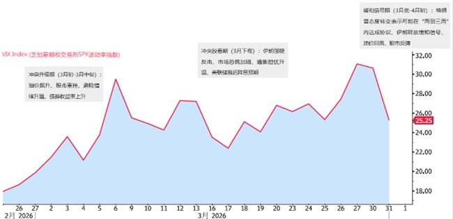 冲突胶着期(3月下旬):VIX再次突破30,反映在伊朗强硬反击、市场恐慌加剧、通胀担忧升温、美联储推迟降息预期。