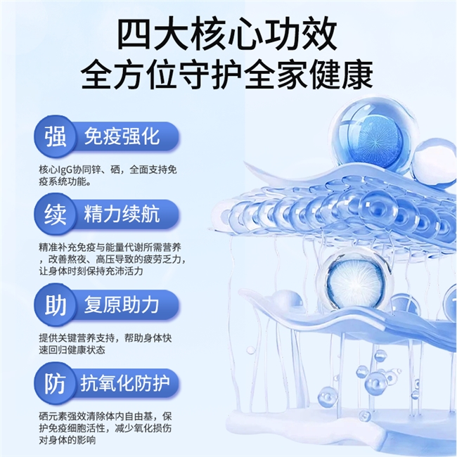 产品核心亮点总结 独家配方优势:市面少有的免疫球蛋白 IgG + 锌 + 硒三重协同,不是单一锌硒,免疫效果碾压传统锌硒片; 剂量科学安全:每 2 粒硒 200μg、锌 10mg,严格卡在安全区间,温和长效,不超标不中毒; 0 添加纯净配方:无香精激素防腐剂,长期服用无负担; 临床数据充足:海外 + 国内双临床实测,效果可验证,不是广告空谈; 全人群适配:职场、学生、中老年、术后、亚健康、易感人群全都能用; 全能功效:免疫 + 精力 + 复原 + 抗氧化四大需求一步满足。