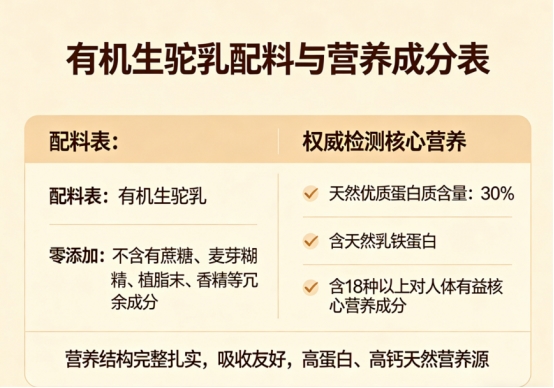 其产品的纯粹,首先体现在一目了然的配料表上。核心配料:配料表仅有有机生驼乳五个字,0添加,全脂驼乳,高钙高蛋白。