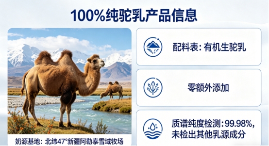 奶源基地位于北纬47°新疆阿勒泰雪域牧场,双峰驼自然散养,饮用冰川融水,采食沙棘、甘草等天然植被。配料表仅有有机生驼乳,实现100%纯驼乳,零额外添加。经质谱纯度检测,纯度达99.98%,未检出其他乳源成分。
