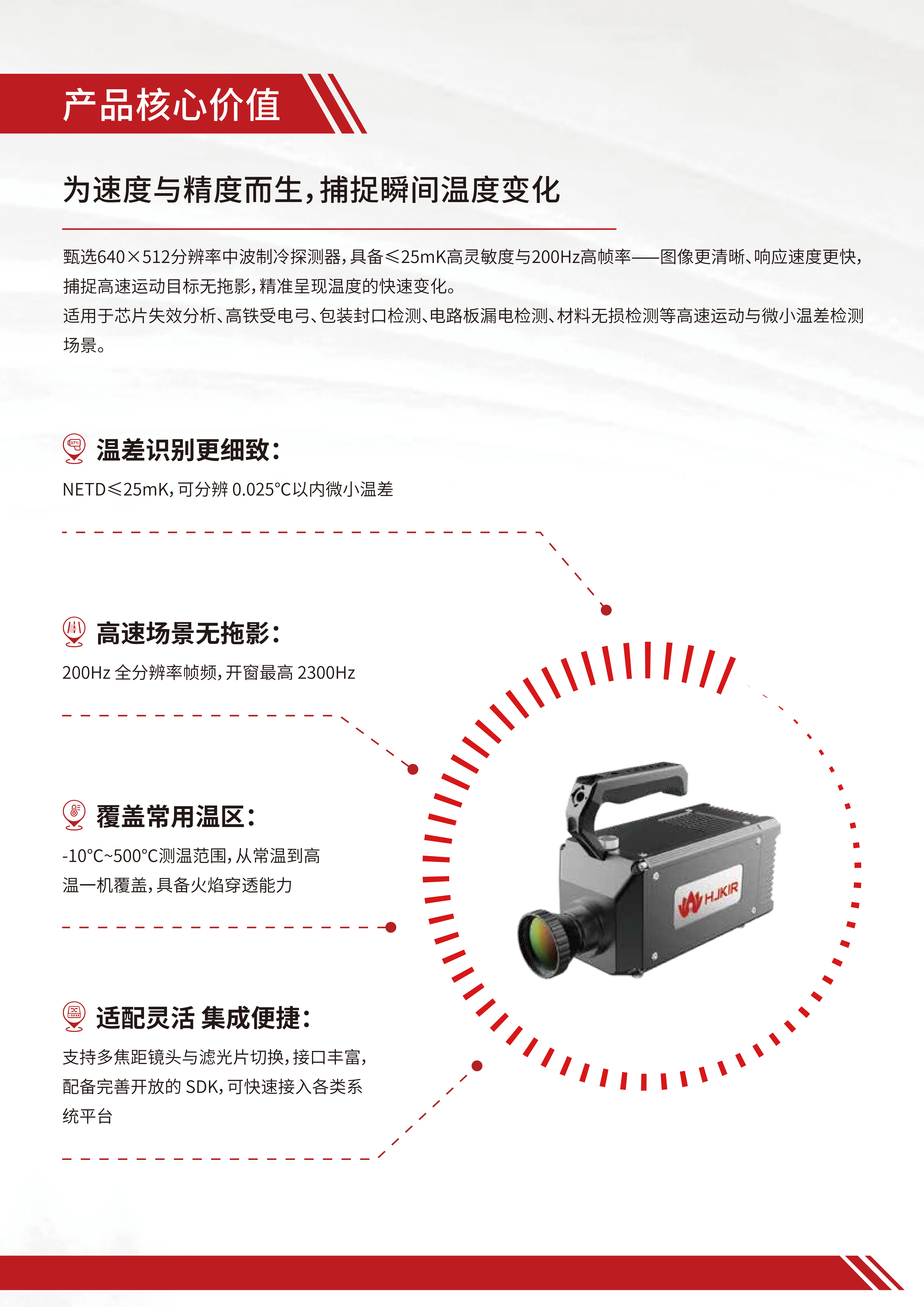 • 无拖影高速捕捉:200Hz 全分辨率帧频,开窗最高可达 2300Hz,捕捉高速运动目标无拖影,精准呈现温度的快速变化,适配瞬态热过程监测。