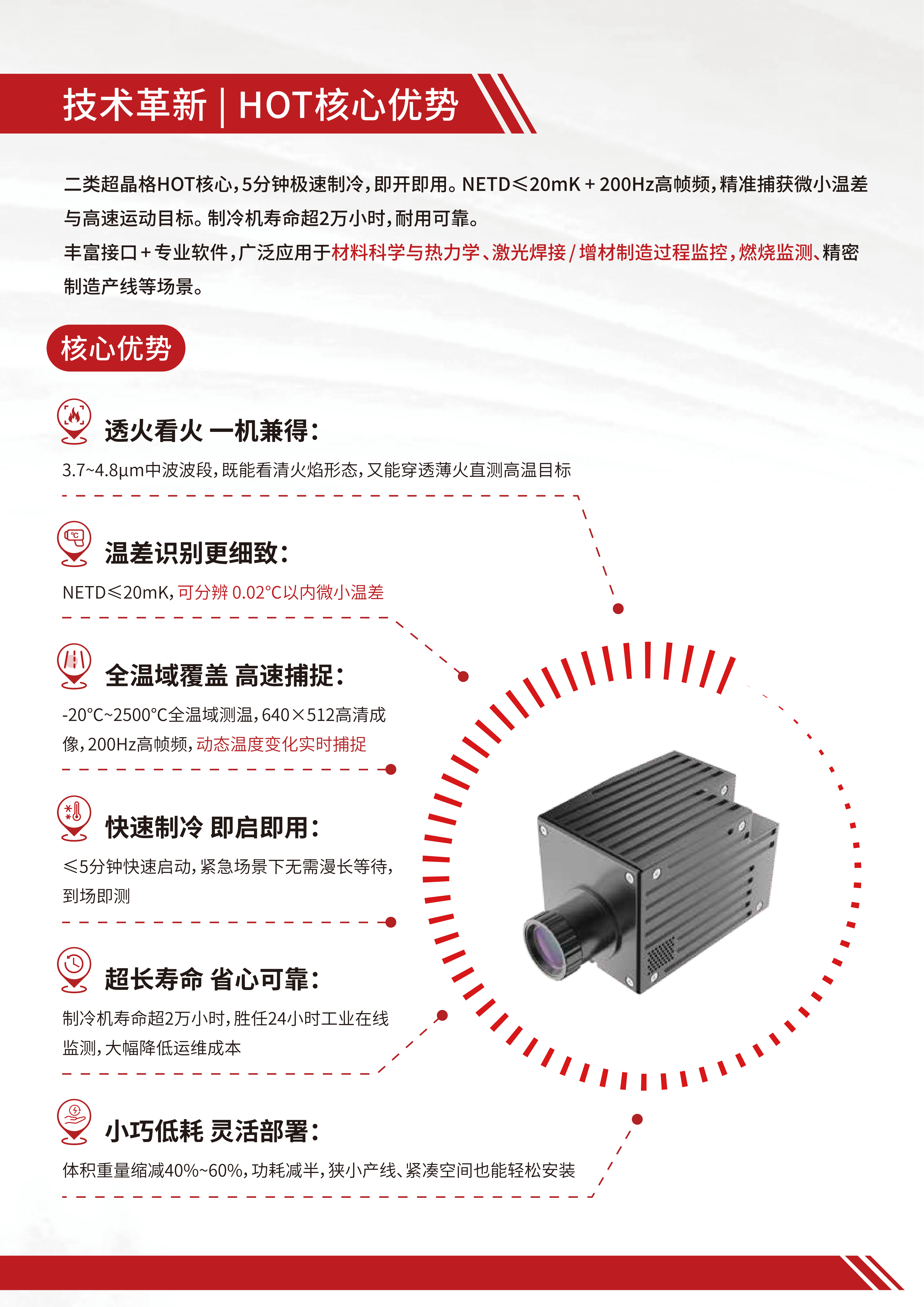 依托 HOT 技术优势,MC26S 广泛应用于四大核心场景:工业高温监测(如激光焊接、燃烧监测)、科研精密探测(如材料热力学研究)、机器视觉检测(如产线在线监测)与能源动力检测(如航天发动机测试),兼顾便捷性与专业性。