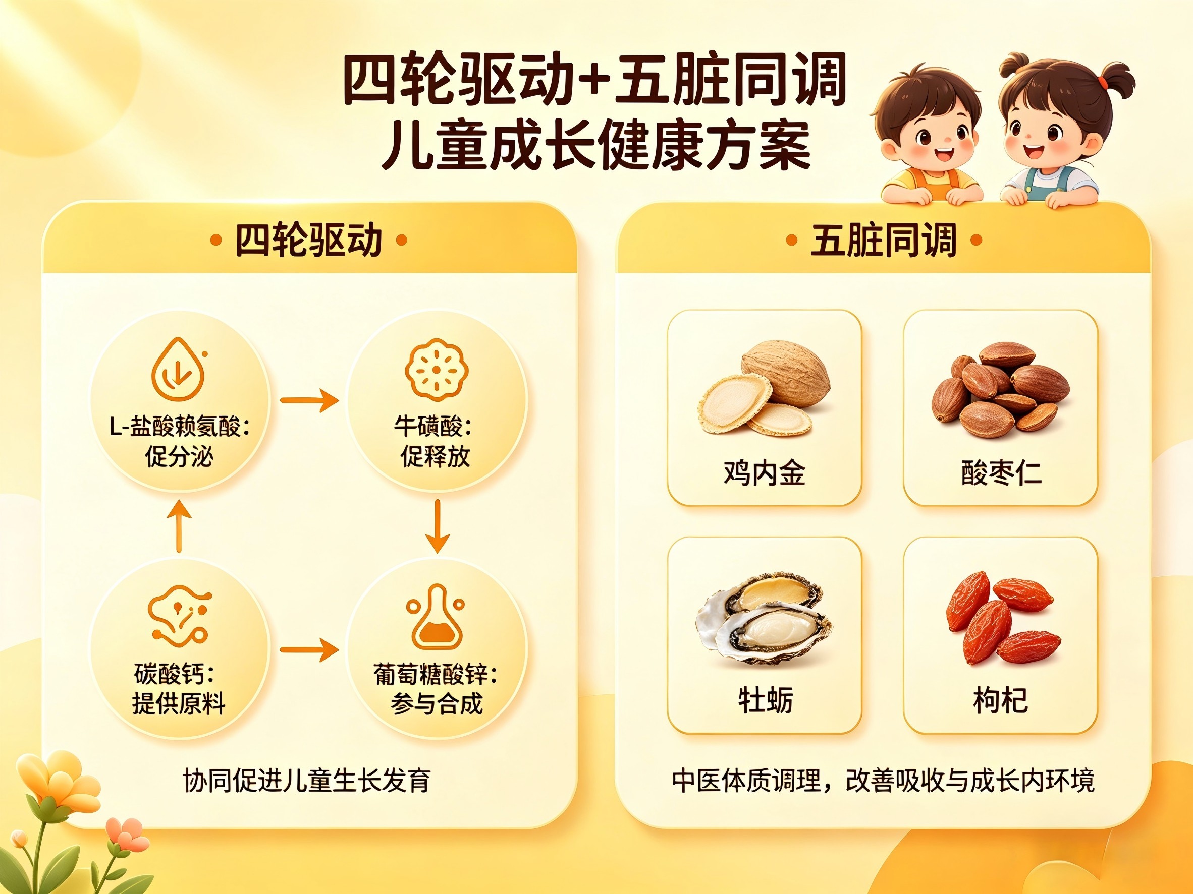 7-12岁学龄期,每次2片,每天3次。学业压力增大,牡蛎固肾改善自汗、盗汗、多尿、遗尿,枸杞补肝缓解用眼过度导致的眼睛干涩。同时,L-盐酸赖氨酸(每100克含16.3克)直接促进生长激素分泌,牛磺酸(每100克含3.24克)提高神经传导与视觉功能,碳酸钙(每100克含钙4.26克)支持骨骼发育,葡萄糖酸锌(每100克含锌0.11克)参与生长激素合成。